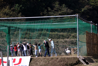 放鳥式では、来賓代表の柳生博さん(コウノトリファンクラブ会長)が、「この地域ではほとんどの農家がコウノトリ育む農法に取り組まれている。その農家のみなさんの願いが実現した。」「野生に戻ったコウノトリがこのような素晴らしい取組みをしている各地に飛んで行って、その人たちの取組みを表彰してあげてほしい」とおっしゃっておられました。