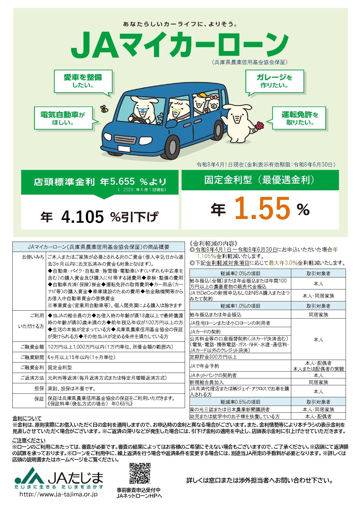 キャンペーンによる金利軽減(年1.105%)と当JAとのお取引利用度による金利軽減(最大年3.00%)を併せてお借入時の基準金利より軽減いたします。