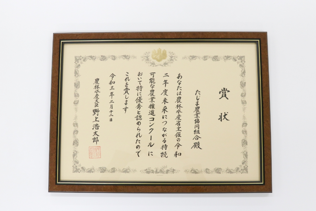 令和2年度には、農林水産省主催の「未来につながる持続可能な農業推進コンクール」の有機農業・環境保全型農業部門で農林水産大臣賞を受賞しました。