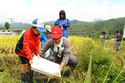この日は、生協の組合員親子14組31人が参加。参加者は協議会員から鎌の使い方を教わって手刈りで稲刈りを楽しんだほか、田んぼの生き物調査では自然環境に配慮した栽培方法の効果を実感しました。