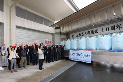 ふるさと但馬米振興会は10月25日、「ふるさと但馬米」(コシヒカリ)の生産10周年を記念して、こうのとりカントリーエレベーターで出荷式を開き、㈱神明の精米施設に玄米13.5tを出荷しました。同振興会員ら約30人が万歳三唱で10年目の出荷を祝いました。