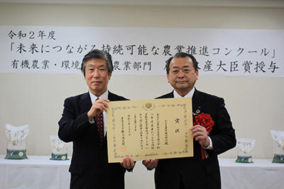 JAたじまが農林水産省主催の「未来につながる持続可能な農業推進コンクール」の有機農業・環境保全型農業部門で最上位の農林水産大臣賞を受賞しました。コウノトリの野生復帰を目指して生産者、行政、JAが三位一体となった環境保全型農業に取り組む体制を構築したことが評価されました。授賞式が3月11日、同JA本店で開かれ、同JAの太田垣哲男組合長が近畿農政局の大坪正人局長から表彰状を受け取りました。