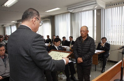 また、生産者の栽培意欲、生産技術と品質の向上を目的に開く岩津ねぎ品評会の入賞者を表彰。朝来農業改良普及センターの鍋谷敏明所長や同部会の荒川部会長ら審査員9人が、ほ場の管理や生育具合、出荷調製の形態などを総合的に審査し、最も優れた生産者として最優秀賞の兵庫県知事賞に朝来市の嵯峨山義博さん(写真)を選びました。嵯峨山さんは、「排水対策や土寄せ作業をしっかりと行ってきた。台風の影響で栽培、出荷には苦労したが、努力が評価されてうれしい」と喜びを語りました。