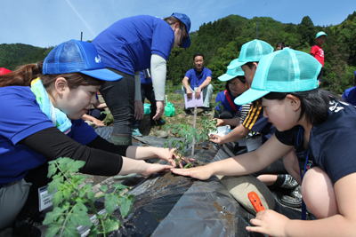 組ごとに分かれて、キュウリ、ナス、ミニトマト、トウモロコシの苗を植えました。