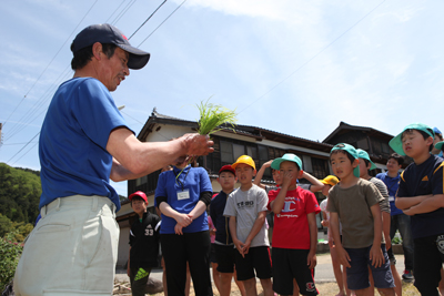 田んぼに入る前に苗の植え方を農家の本田澄夫さんから教わります。