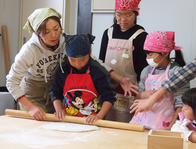 うすくのばした生地を専用の包丁で切っていきます。一定の太さに切っていくのもなかなかうまくいきません。おうちの人と一緒にがんばりました。