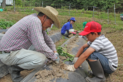 ちゃぐりんの時間の後は、農家の谷口修さんに教わりながら、ジャガイモの収穫とサツマイモの植え付けを体験しました。