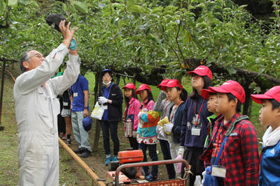 この日は、さっそくバスに乗ってナシ園に移動し、ナシの収穫を体験しました。