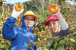 ちゃぐりんの時間終了後にバスに乗って八鹿町にあるカキ園に移動し、カキの収穫を体験しました。