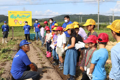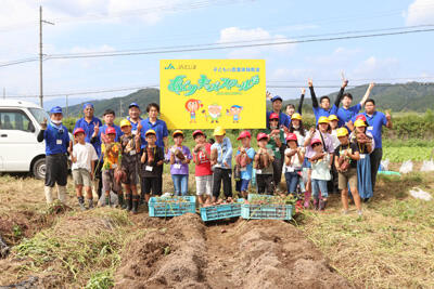 最後に、集合写真をパシャリ。みんなの顔より大きいサツマイモがいっぱい取れたね!