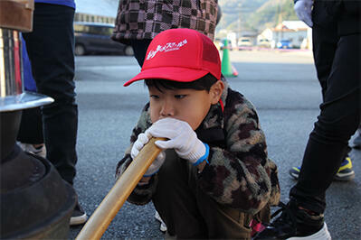 村岡営農生活センターの駐車場に移動して、かまどで炊飯体験を行いました。まずかまどに薪をくべて火をつけます。慣れない火おこしに戸惑っていましたが、ちゃんと火を着けることができました。沸騰して泡が出てきたら火を消します。あとは待つのみ!中を見たい気持ちをおさえて蒸らします。
