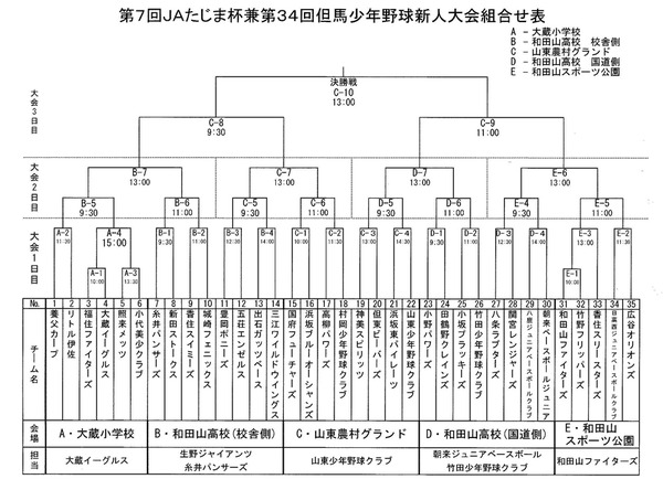 9月13日、朝来市のさんとう緑風ホールで、第7回JAたじま杯兼第34回但馬少年野球新人大会の組み合わせ抽選会が開かれ、大会トーナメントの組み合わせが決まりました。但馬全域から35チームが出場し、9月27日に朝来市内の5会場で第1回戦を行います。
