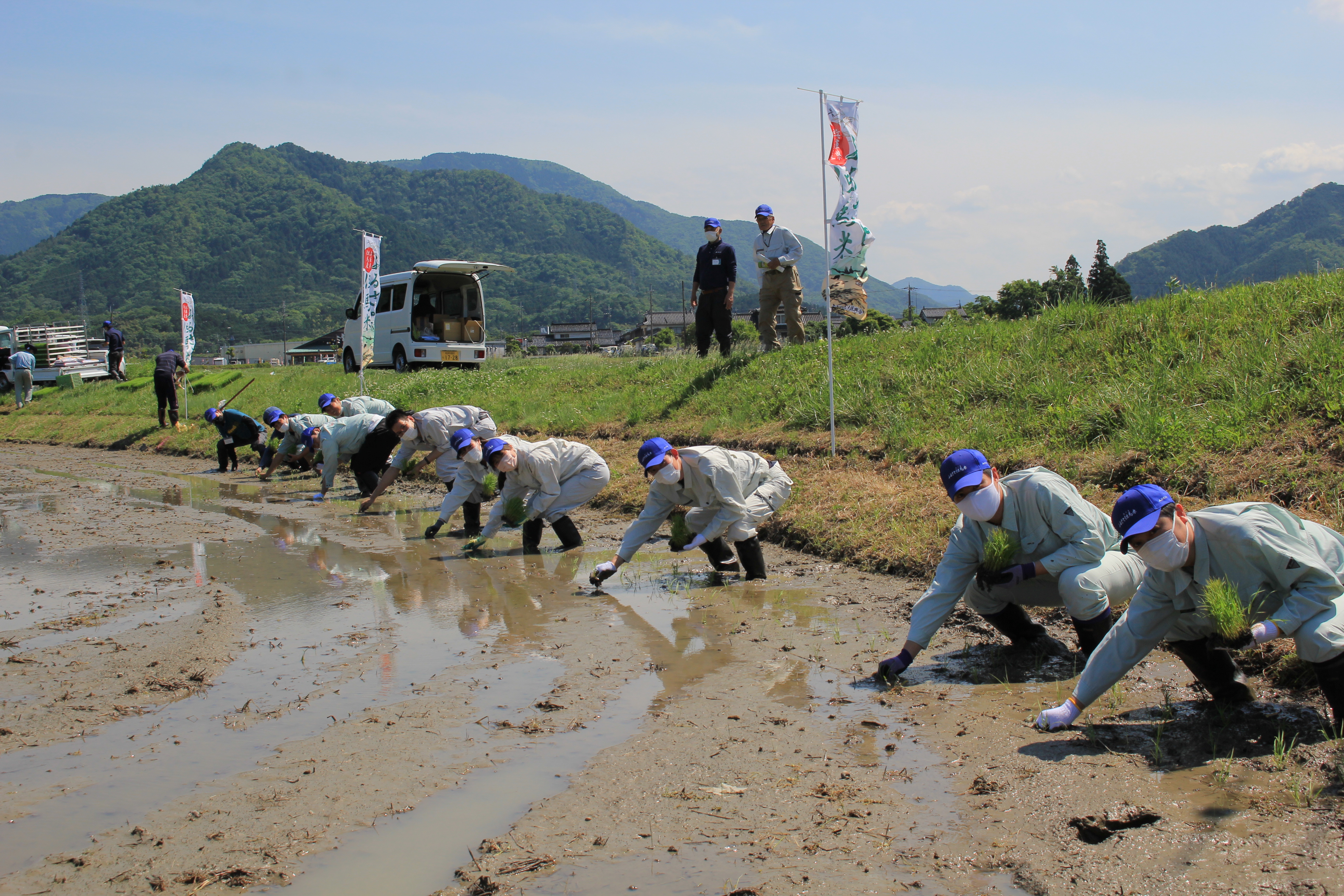 4月に種まき、5月の田植え、6月は草刈りなど、流通関係者も生産者と一緒になって「ふるさと但馬(たじま)米」のお米作りに携わります。