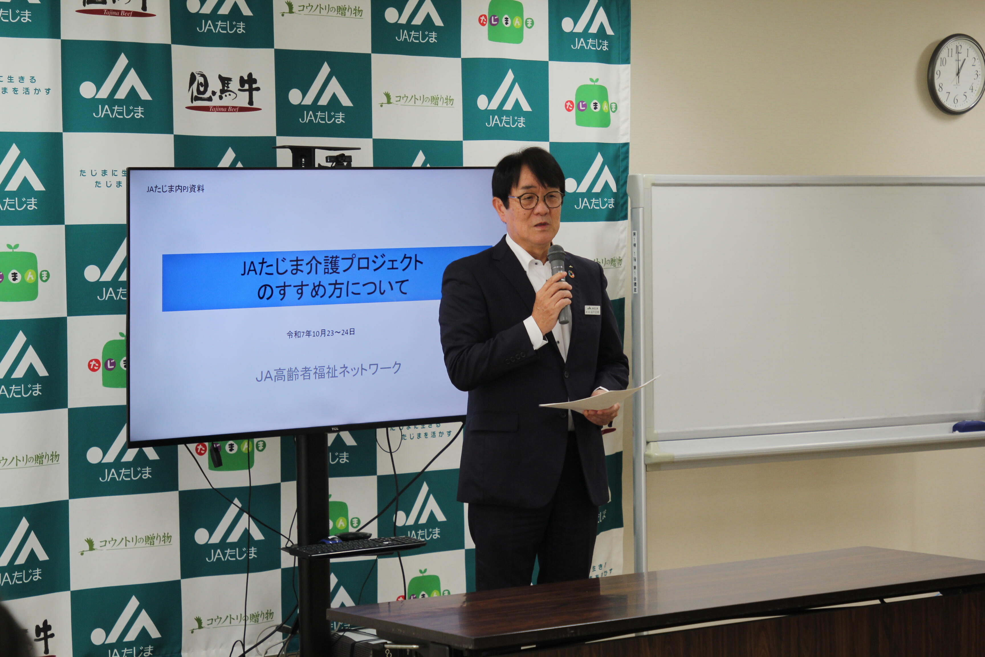 「あらゆる角度から、JAたじま福祉事業を見ていただき、中期計画Plan2027にある"選ばれるJA介護福祉事業"となってほしい。プロジェクトを通して"現場の声を聞く、効率化、経費削減、生きがいのある職場づくり"を職員全員で知恵と経験を結集させ取り組んでもらいたい。今回のプロジェクトが介護福祉事業の大きな発展となることを期待しています」とお言葉をいただきました。 JA全中 高齢者福祉ネットワーク 事務局長 今井 準幸 様を講師に迎え、第1回目は「介護理念、コンセプト再構築の検討」です。 講師先生からは、職員間で「ケアの目線」を統一することがとても大切、JAたじまとしてどう言うケアを提供したいか?今あるJAたじまの介護理念がなぜ職員に浸透していないか?そもそもケアの目線が統一されていないからではなかろうか?理念を具現化するための仕掛け作りと職員教育の重要性についてご説明いただきました。