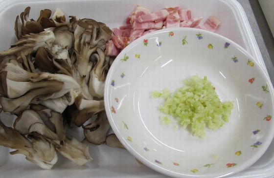 最初の料理は「舞茸のベーコン炒め ゆず風味」材料はこちら