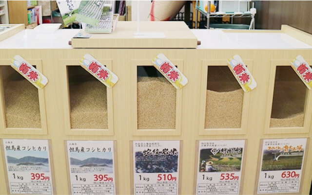 お米の量り売りコーナー。ご注文いただいてから、精米いたします。黒大豆などの豆の量り売りもしています。