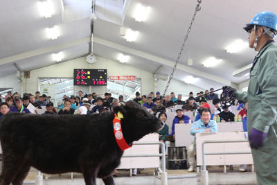 県内の繁殖農家が雌162頭、去勢190頭の計352頭を上場。雌と去勢を合わせた平均価格は前回の12月市(82万8697円)から約7・9%安の76万3578円で、80万円台を割るのは約3年半ぶりの結果となり、総販売額は2億6877万9500円でした。全国的に子牛価格は下落しており但馬牛もこの傾向での推移となりました。